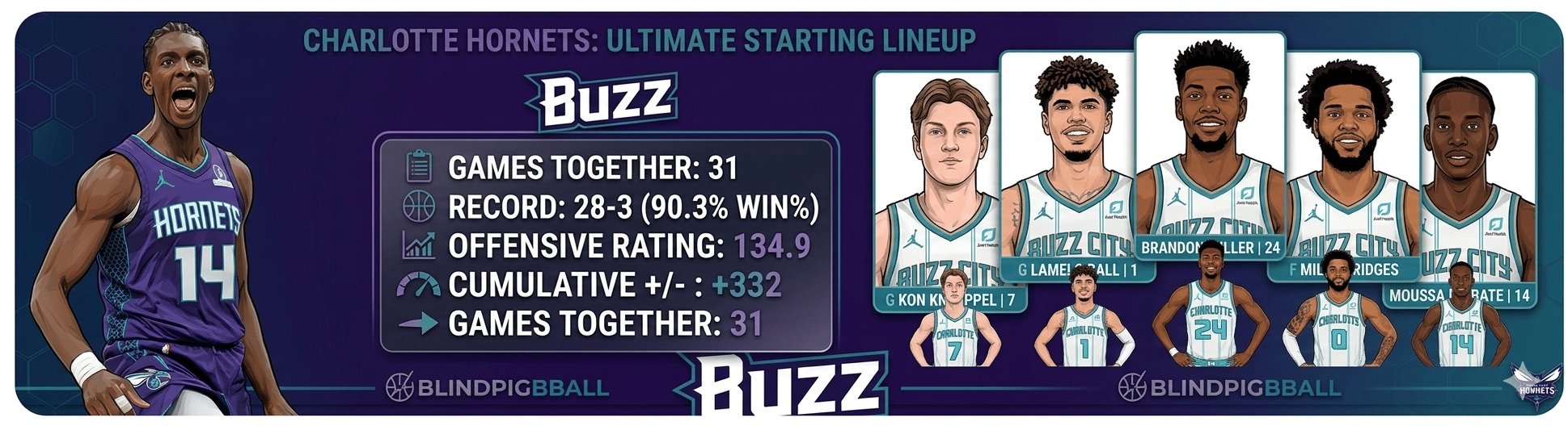 When the Hornets are fully healthy - which has mostly been the case since the new year - and take the floor with their starting five of Diabaté, Miles Bridges, Kon Knueppel, Brandon Miller, and LaMelo Ball, their record is an astonishing 28-3, a 90.3% win rate. That lineup's offensive rating of 134.9 is the highest in the league.