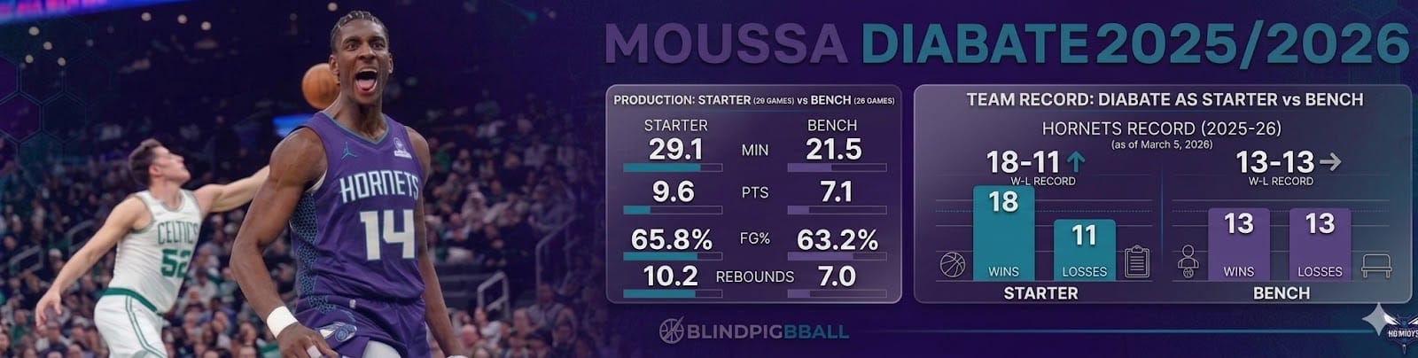This season, Charlotte opened the season with only two centers in rotation: Diabaté as the backup and Ryan Kalkbrenner, who started the year at the five. Most analysts dismissed this duo, and the Hornets were widely expected to be lottery-bound again.